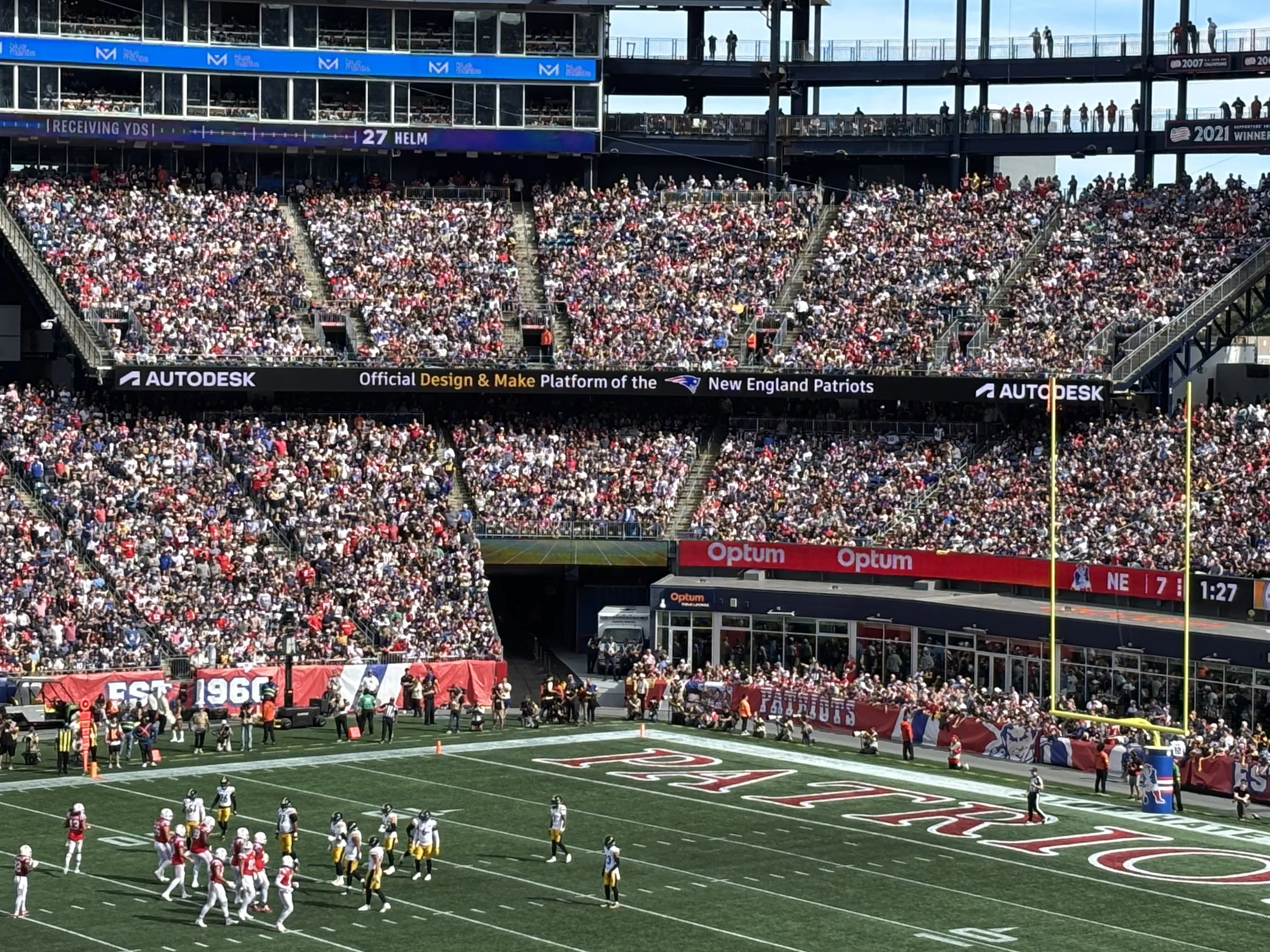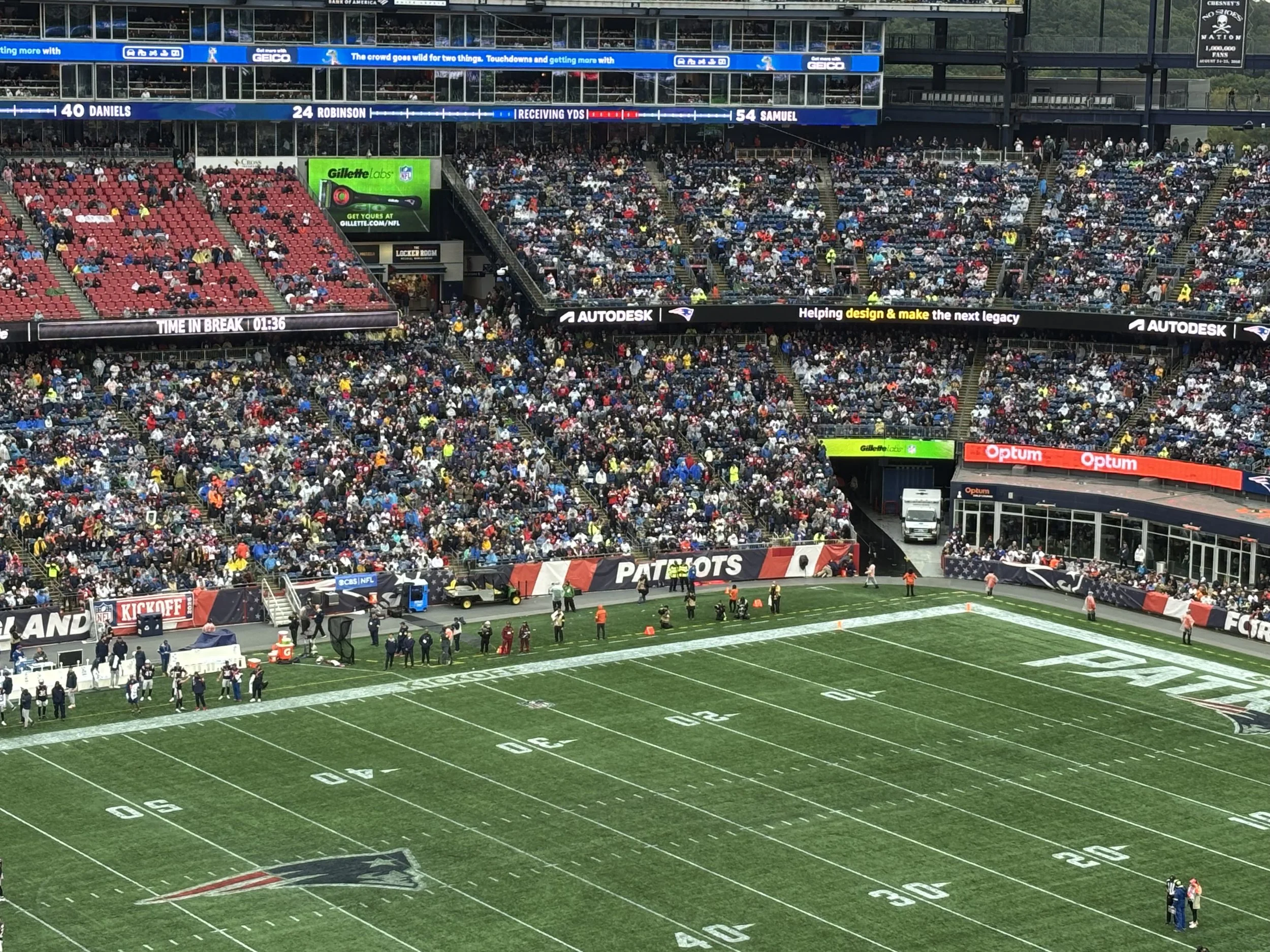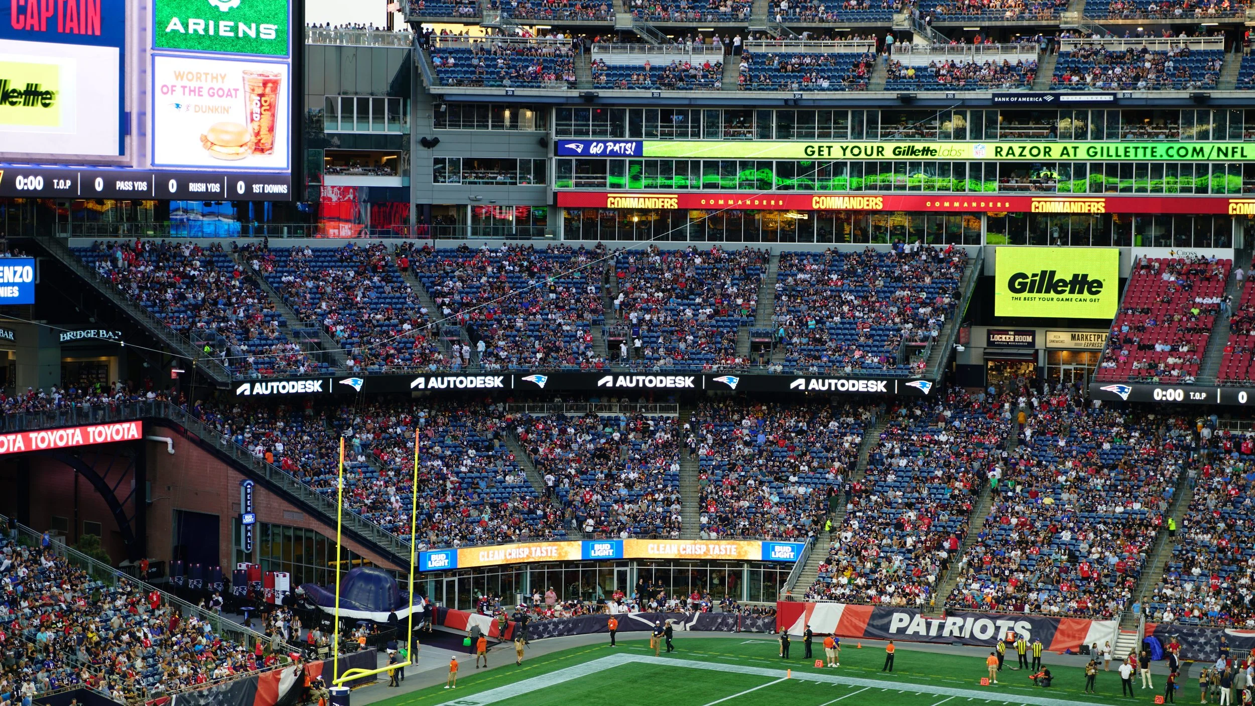 Dynamic LED corner end zone and south end zone signage visible at all Patriots home games at Gillette Stadium